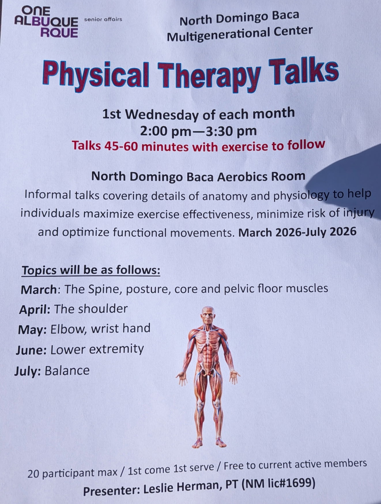 Physical Therapist Talks Wednesday March 4, 2026 at 2:00 pm North Domingo Baca Multigenerational Center 7521 Carmel Ave NE, 2nd Floor, Abq